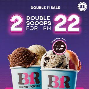 Baskin Robbins 11.11 Sale: Get 2 Double Junior Scoops for RM22. Valid 10–16 Nov 2025 at outlets in Malaysia except TRX & Kidzania. T&Cs apply.