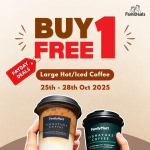 Enjoy FamilyMart Payday Sale Buy 1 Free 1 Large Hot/Iced Coffee via MY FamilyMart App. Valid 25–28 Oct 2025 in Malaysia on FamiDeals.