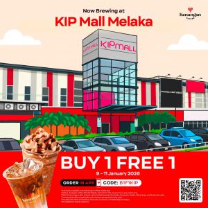 Kenangan Coffee opens at KIP Mall Melaka! Enjoy Buy 1 Free 1 on selected drinks using voucher code B1F1KIP. Valid 9-11 Jan 2026 exclusively via the App.