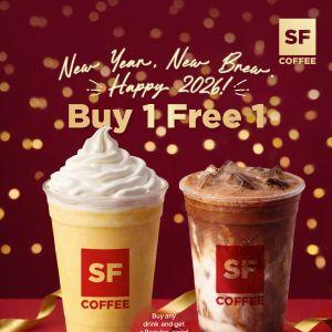 Celebrate 2026 with San Francisco Coffee! Enjoy Buy 1 Free 1 on all regular-sized drinks. Valid on 1 Jan 2026 only. Dine-in & Takeaway available.